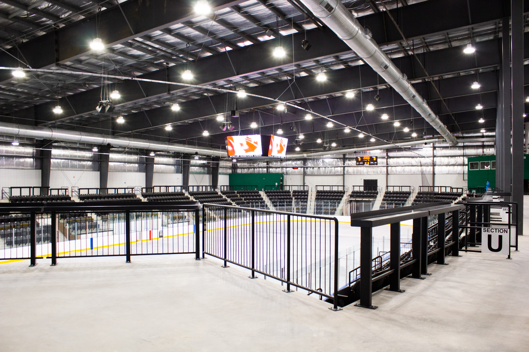 In the arena, the concrete for the ice surface has been poured and finished and lighting has been installed. The foundation of the seating area is in place, and contractors are installing the seats and rink boards. The jumbotron is set to be installed near the end of the project.